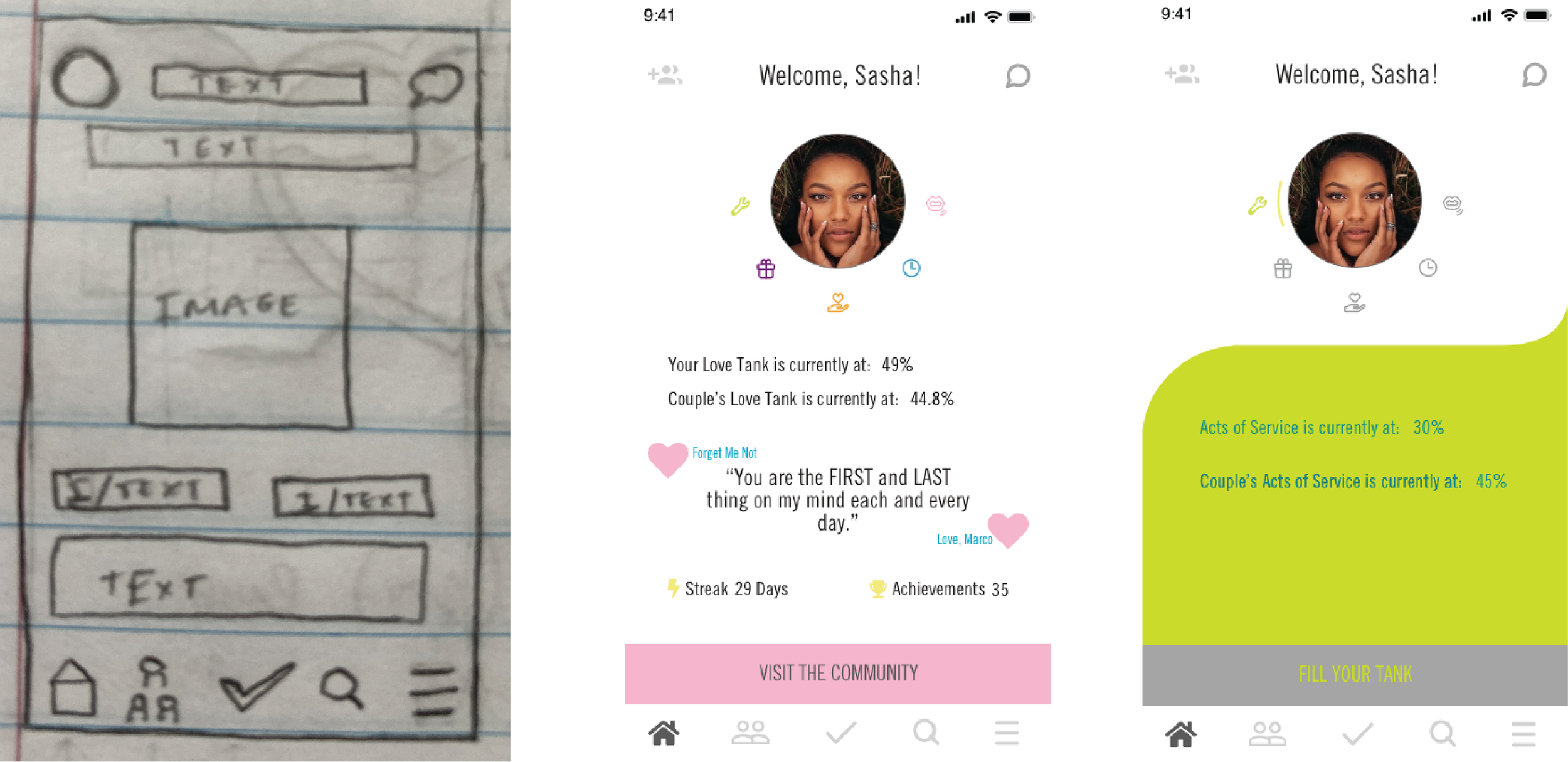 This page displays a profile picture with a fulfillment gauge. Each icon provides the percentage of that love language tank, individually and as a couple. Couples can leave love notes for each other, see their personal streak and achievements as well as navigate to messages and the community.